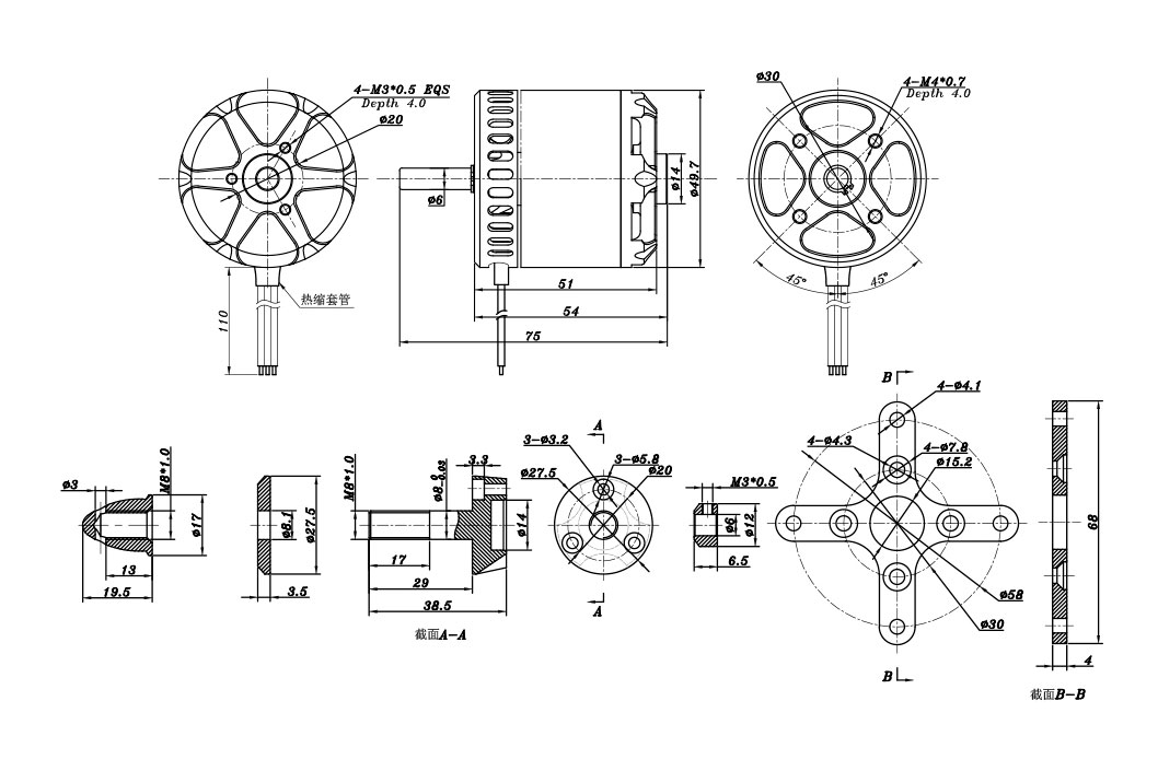 Motor installation: KAVAN 5050-515 has been designed both for the front and radial mount installation. Front mount: Use four M4 screws; these may not go deeper than 4-5 mm into the front case. Radial mount: Use four M4 screws to secure the mounting cross to the firewall. The firewall should be made of 6.0-8.0 mm plywood. The radial mount set is supplied with the motor.